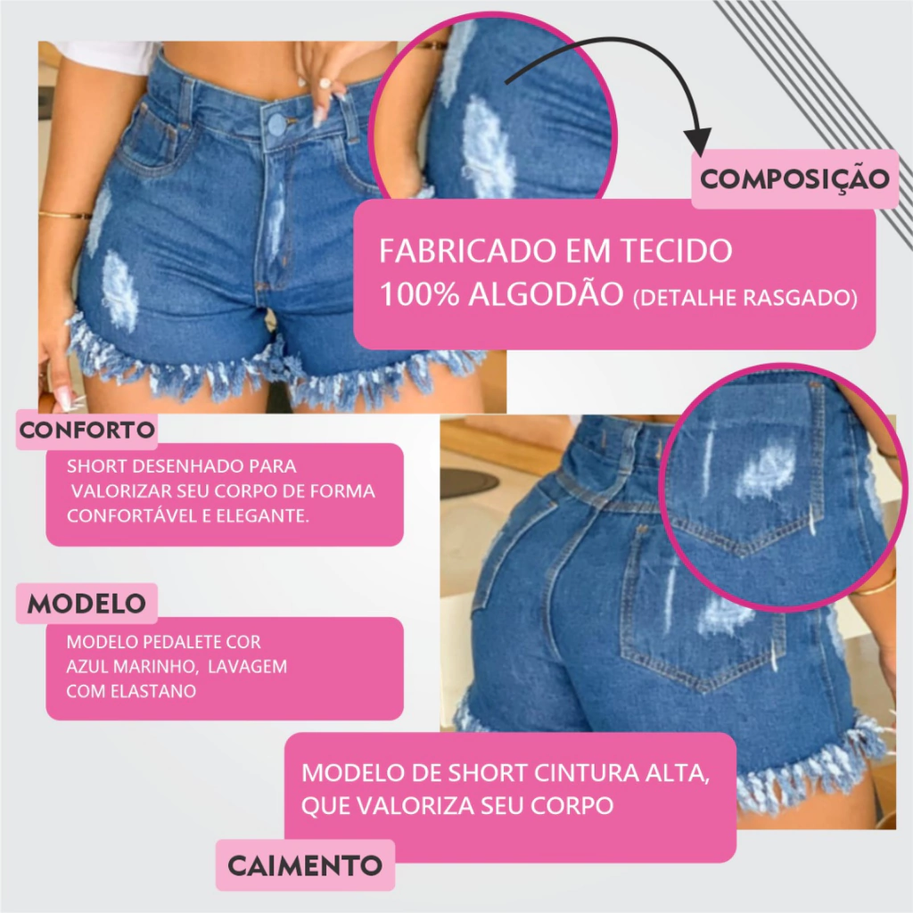 Short Jeans Feminino Cintura Alta Modelo Detonado, são especialmente desenvolvidas para Mulheres modernas e empoderadas. Com uma modelagem diferenciada que se ajusta ao corpo de maneira confortável.