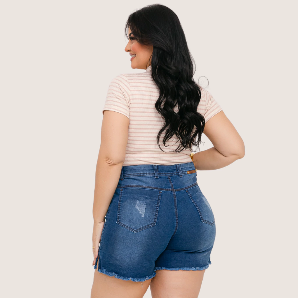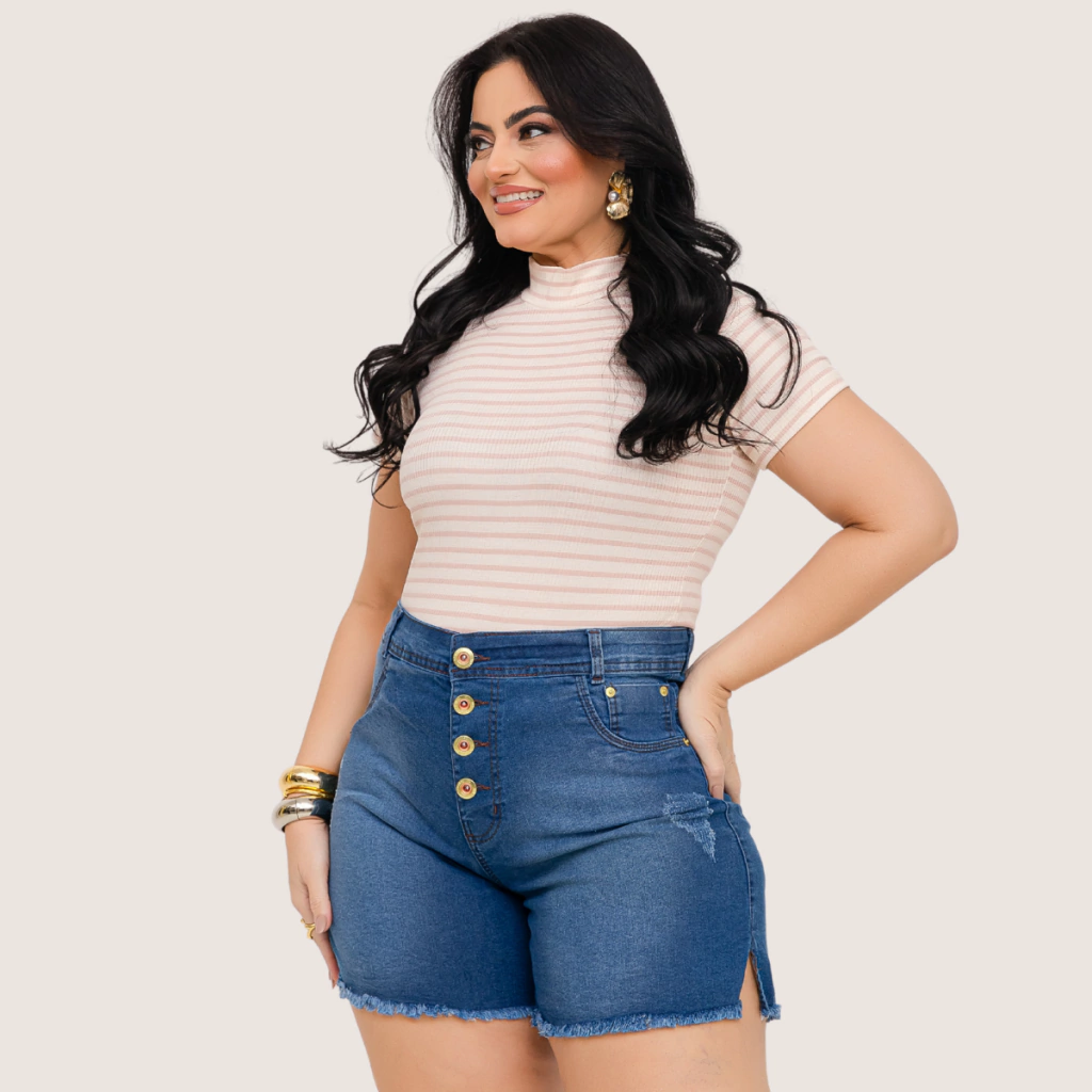 Perfeito para compor looks casuais ou despojados, o Short Jeans Feminino Plus Size Botões Dourados é uma escolha ideal para quem valoriza moda e praticidade. Adquira o seu e esteja sempre pronta para arrasar!