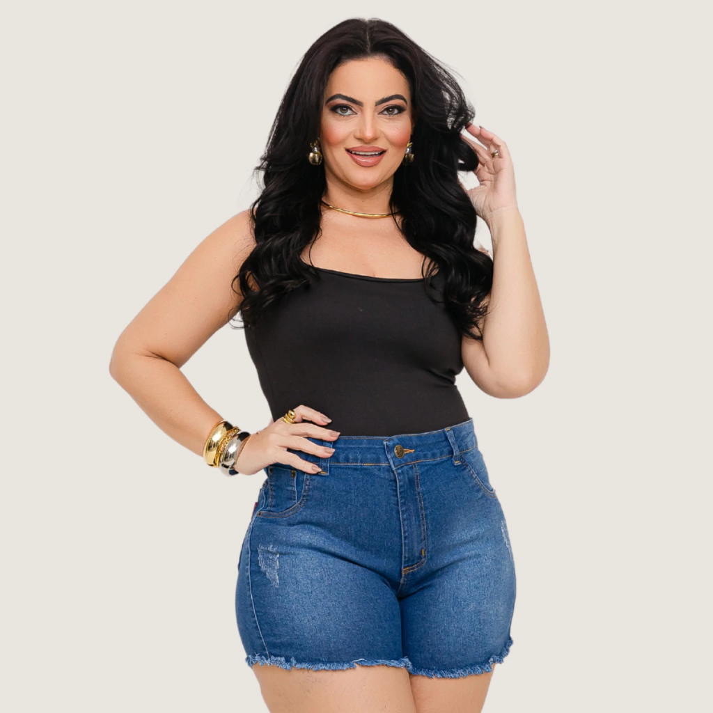 Perfeito para compor looks casuais ou despojados, o Short Jeans Feminino Plus Size Azul Barra Desfiada é uma escolha ideal para quem valoriza moda e praticidade. Adquira o seu e esteja sempre pronta para arrasar!