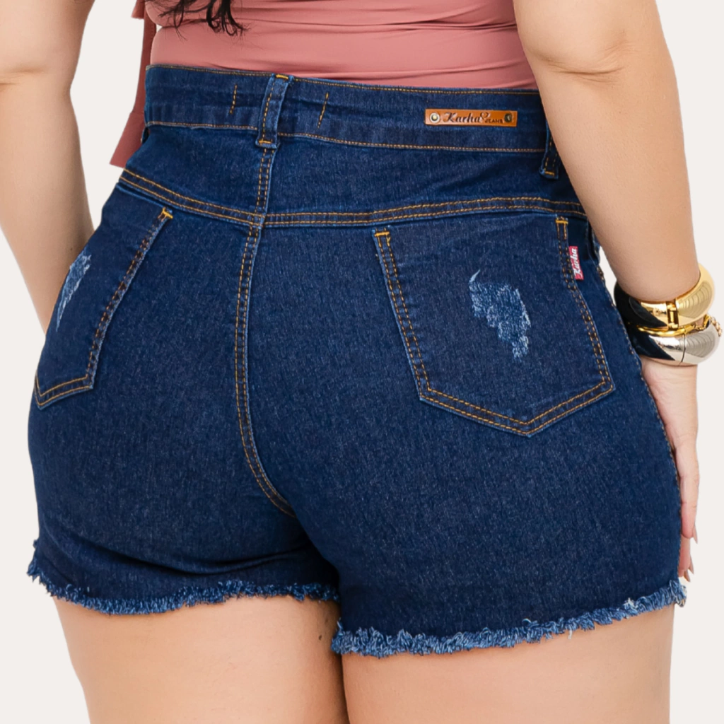 Perfeito para compor looks casuais ou despojados, o Short Jeans Feminino Plus Size Azul Escuro Barra Desfiada é uma escolha ideal para quem valoriza moda e praticidade. Adquira o seu e esteja sempre pronta para arrasar!