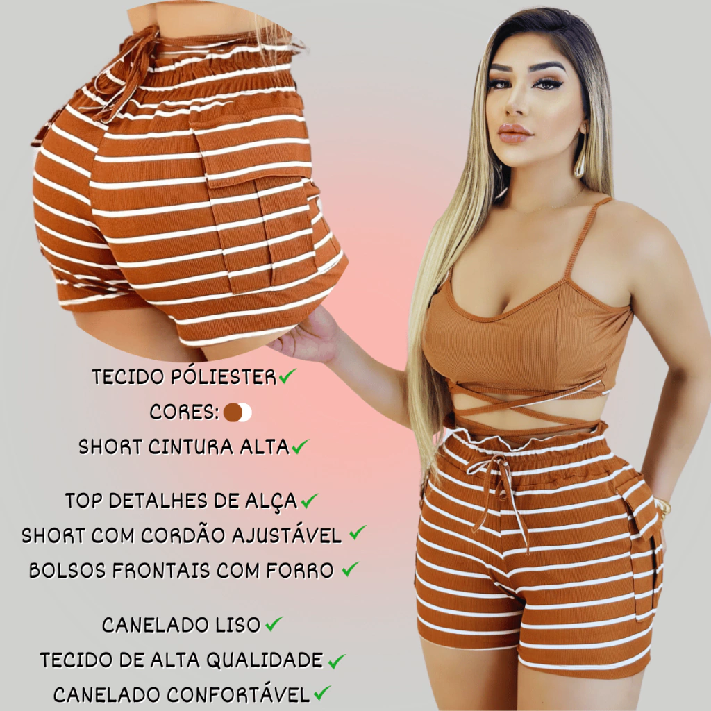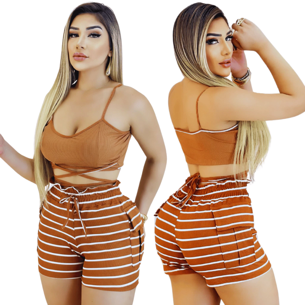 Descrição do Produto: Conjunto Feminino Top com Alça e Short Ajustável Marron Listrado
