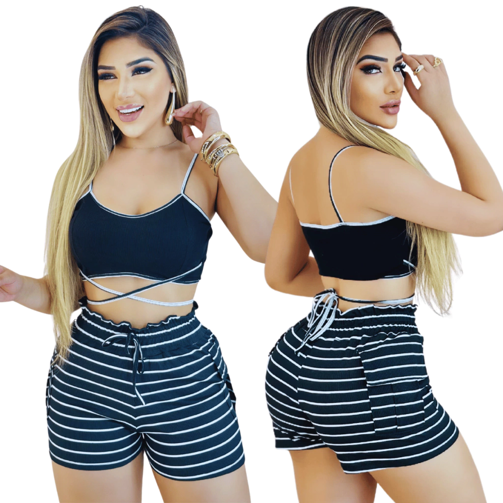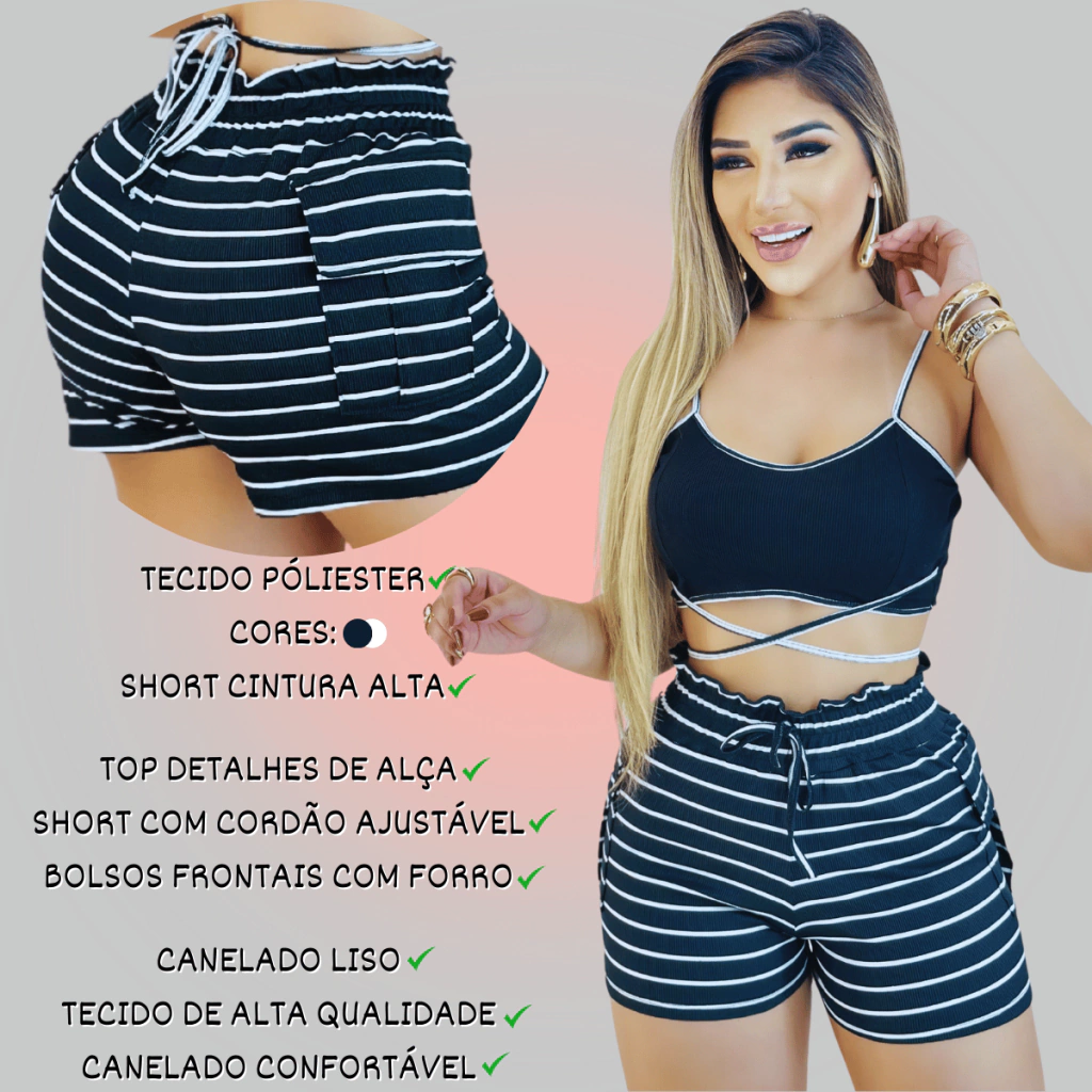Descrição do Produto: Conjunto Feminino Top com Alça e Short Ajustável Preto Listrado