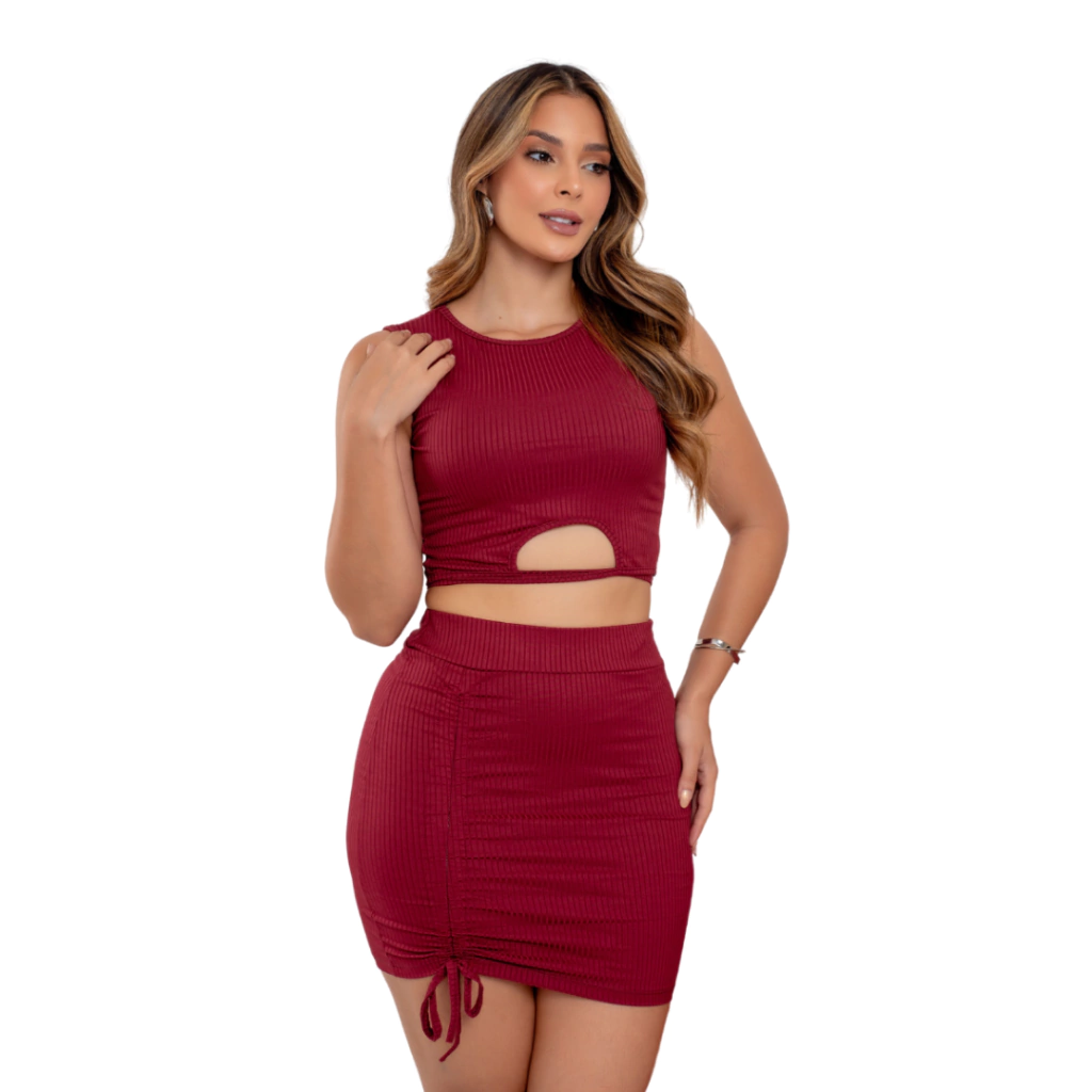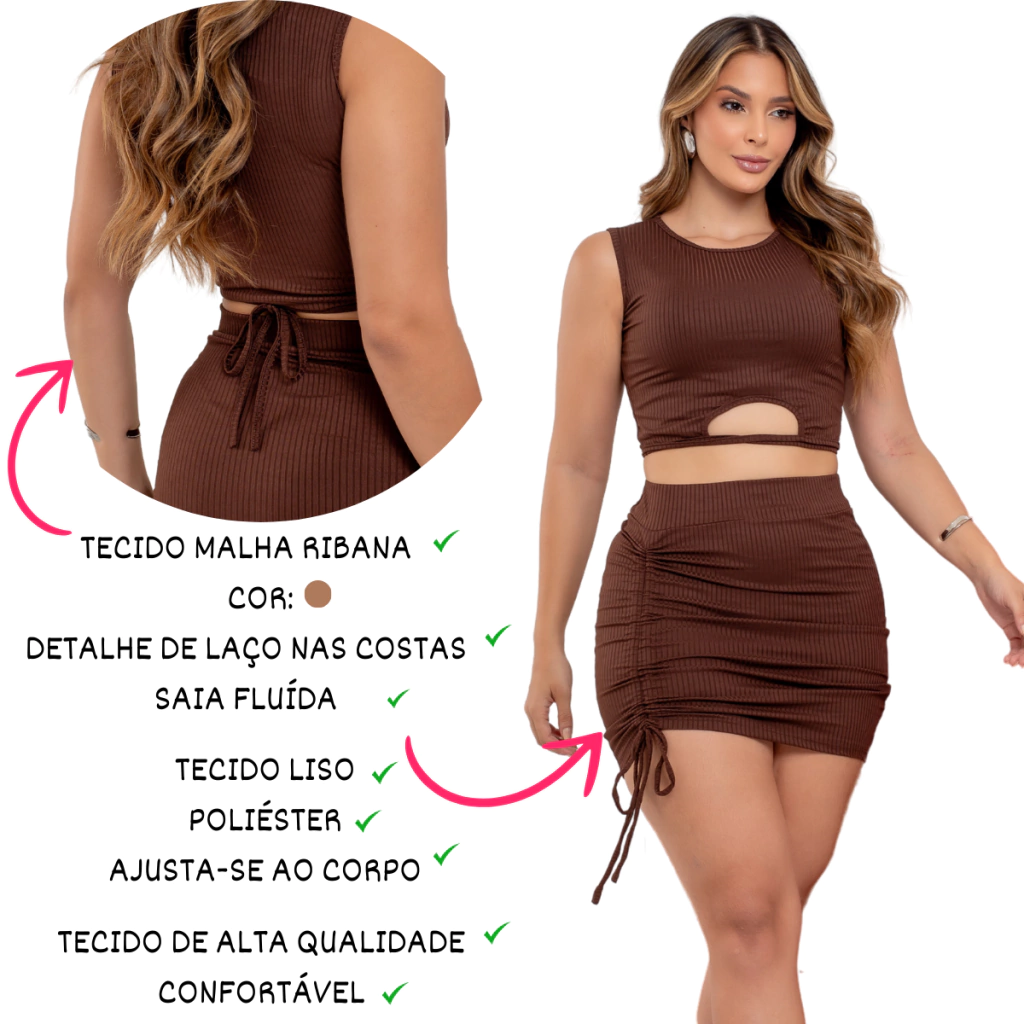 Descrição do Produto: Conjunto Feminino Blusa sem Mangas e Saia Ajustável
