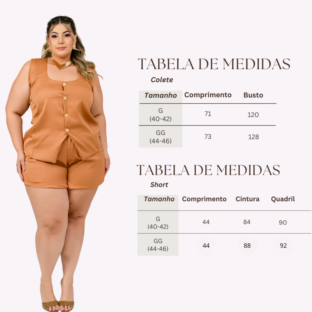 GG (50/52): Comprimento 44 | Cintura 98 | Quadril 92