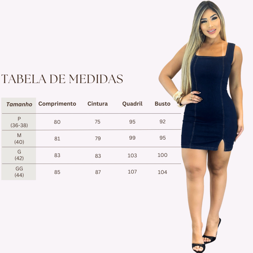Tamanho P (36-38): Busto 68, Cintura 75, Quadril 95, Comprimento 80